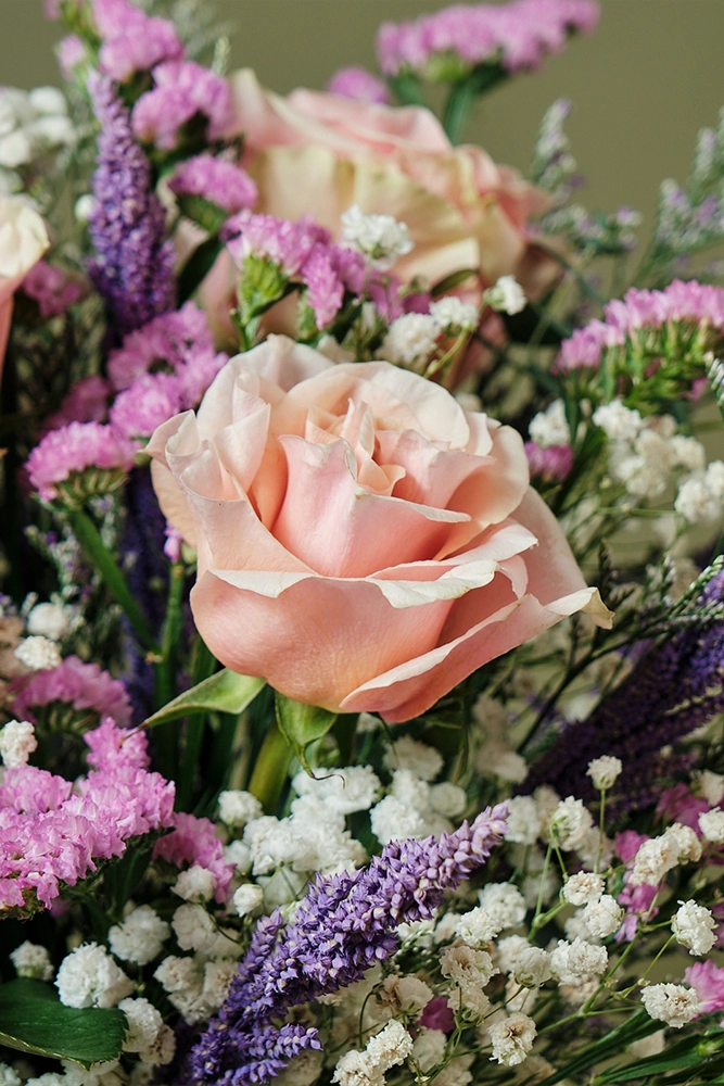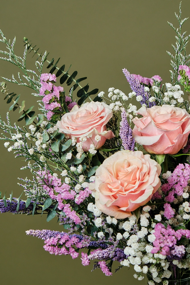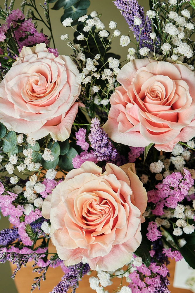 Blush & Bloom is made up of Peach Roses, Statice, Eucalyptus, and Fillers.