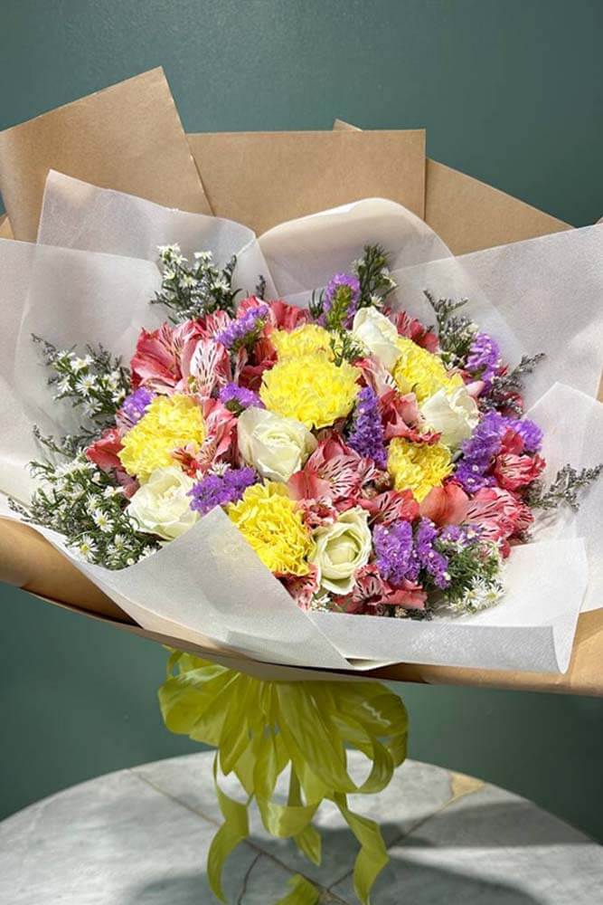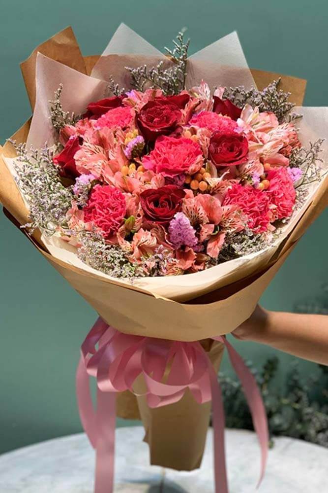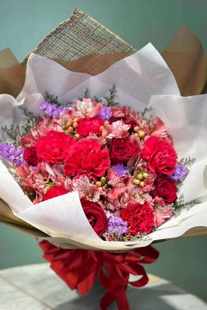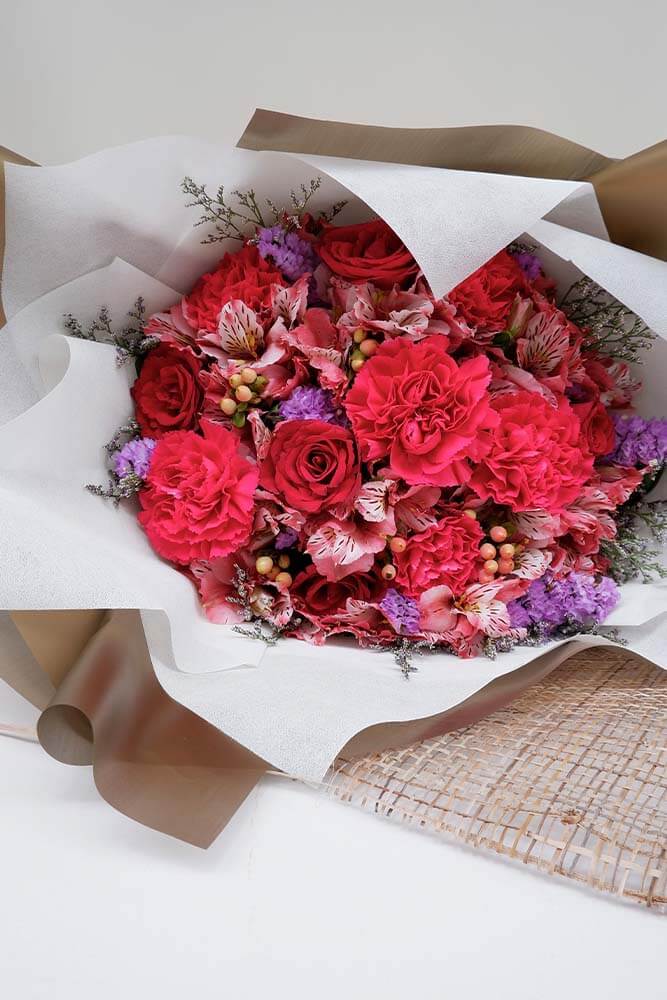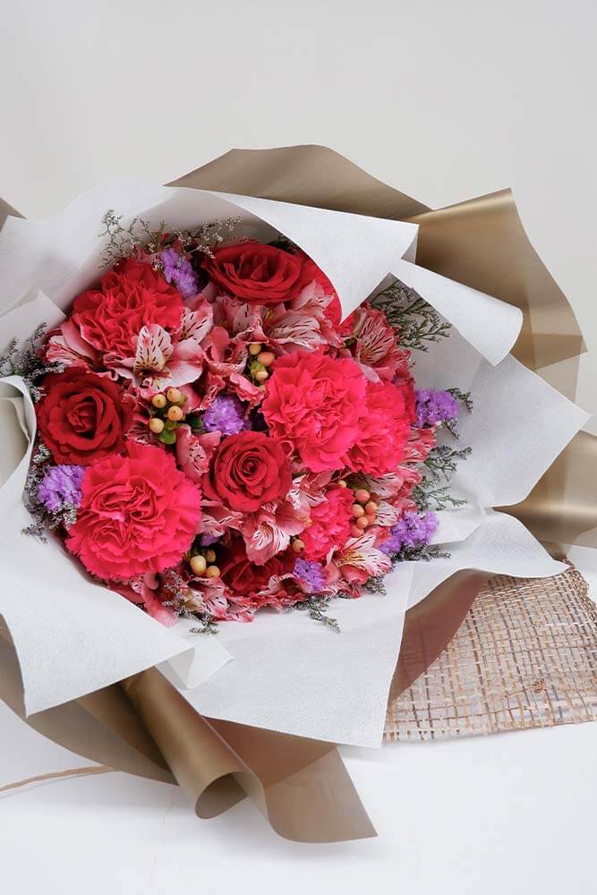 There’s glam, and then there’s Butterfly Kisses. As floral arrangements go, few rival the luxury and elegance that this lovely blend exudes. Carnations and Alstroemeria bring the drama in varying shades of pink, red, and purple.