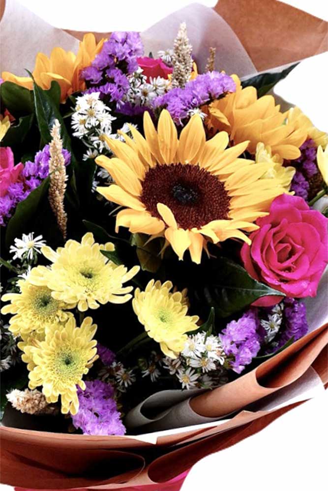 Chasing The Sun is made with Sunflowers, pink roses, green carnations, yellow chrysanthemums, purple statice, and white asters.