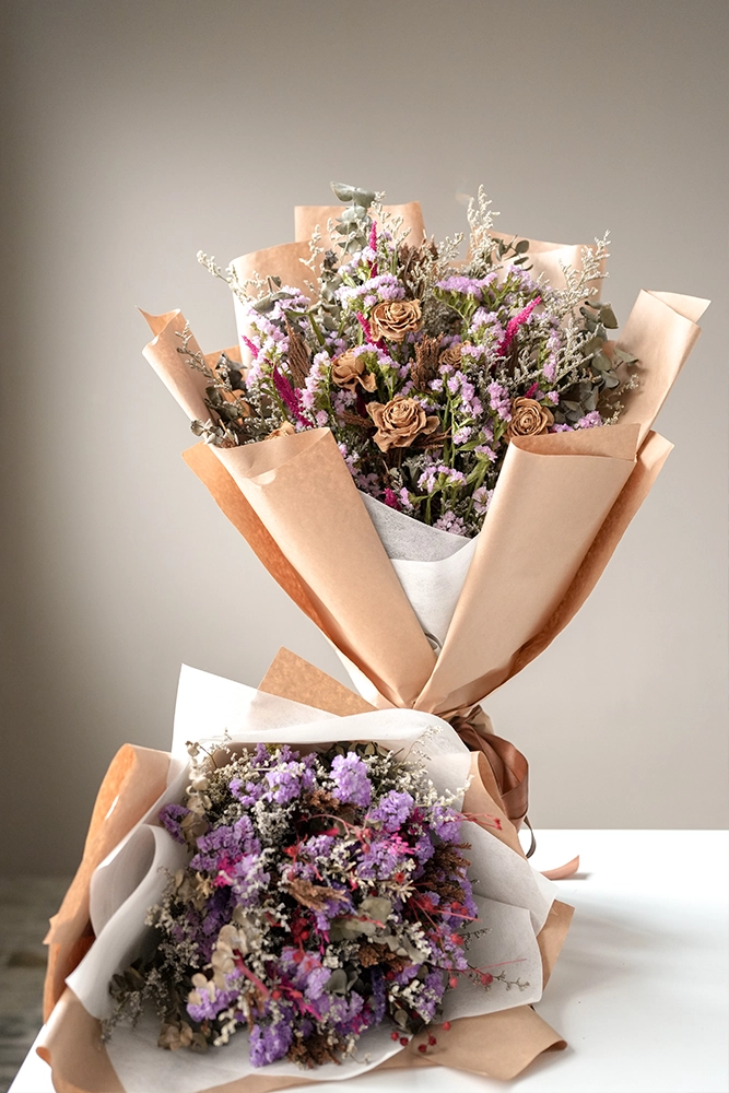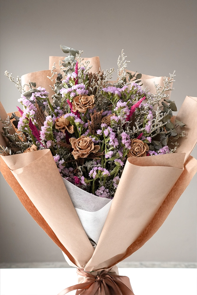 Dried local pink roses mixed together with dried statice, dried eucalyptus, dried misty blue, dried colored wheat and dried gypsophila