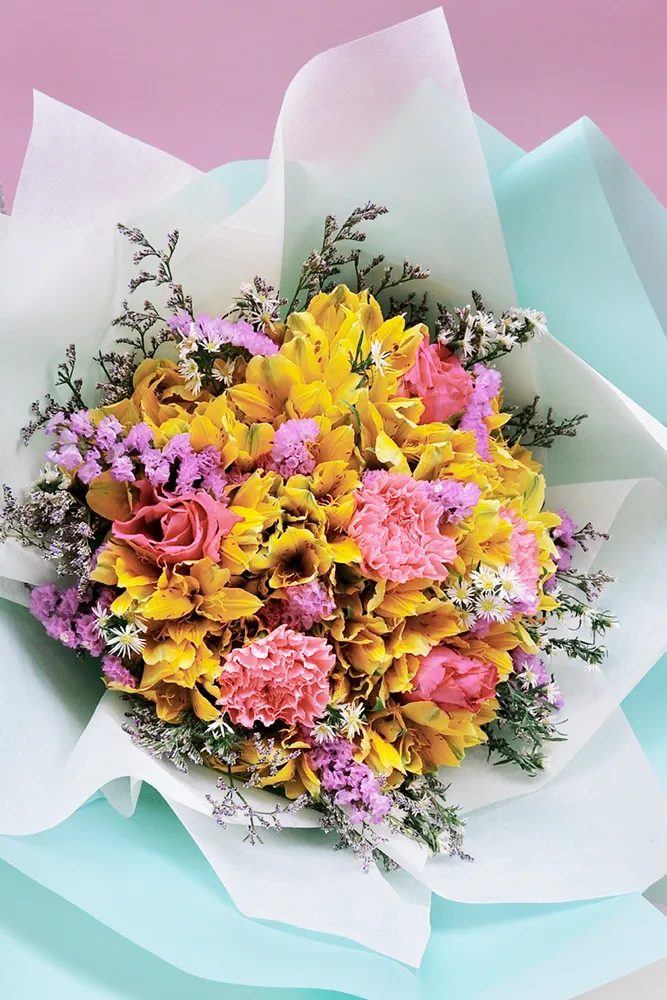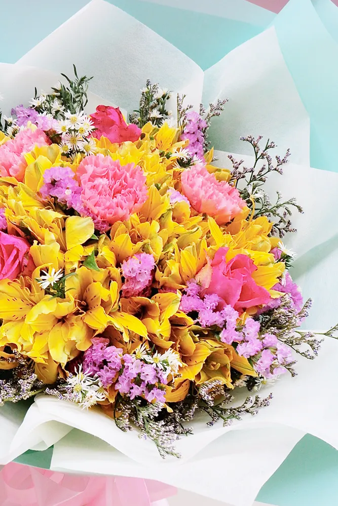 Happy Thoughts is made with Local pink roses, baby pink carnations, yellow alstroemeria, pink statice, misty, aster, and greens.As for the wrapping, you may choose from the following options: