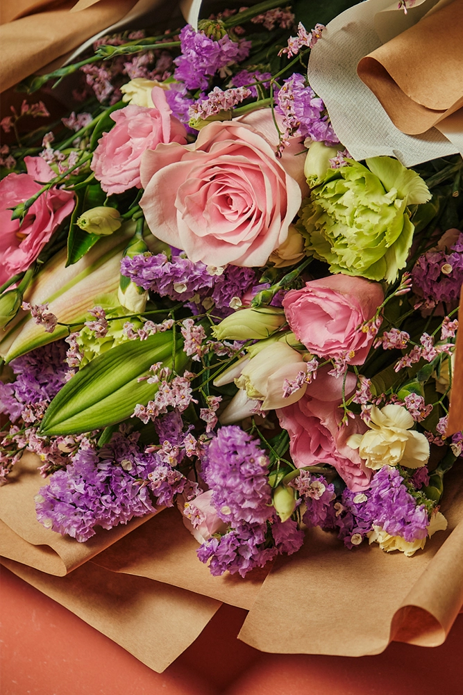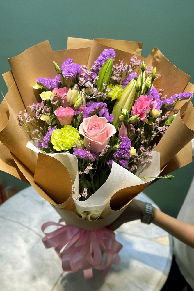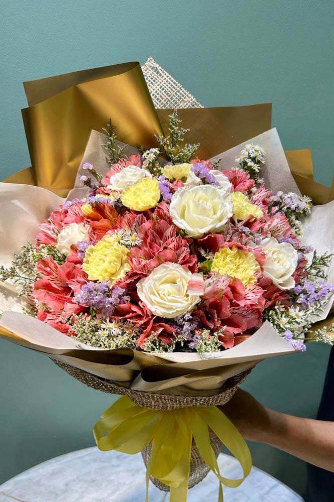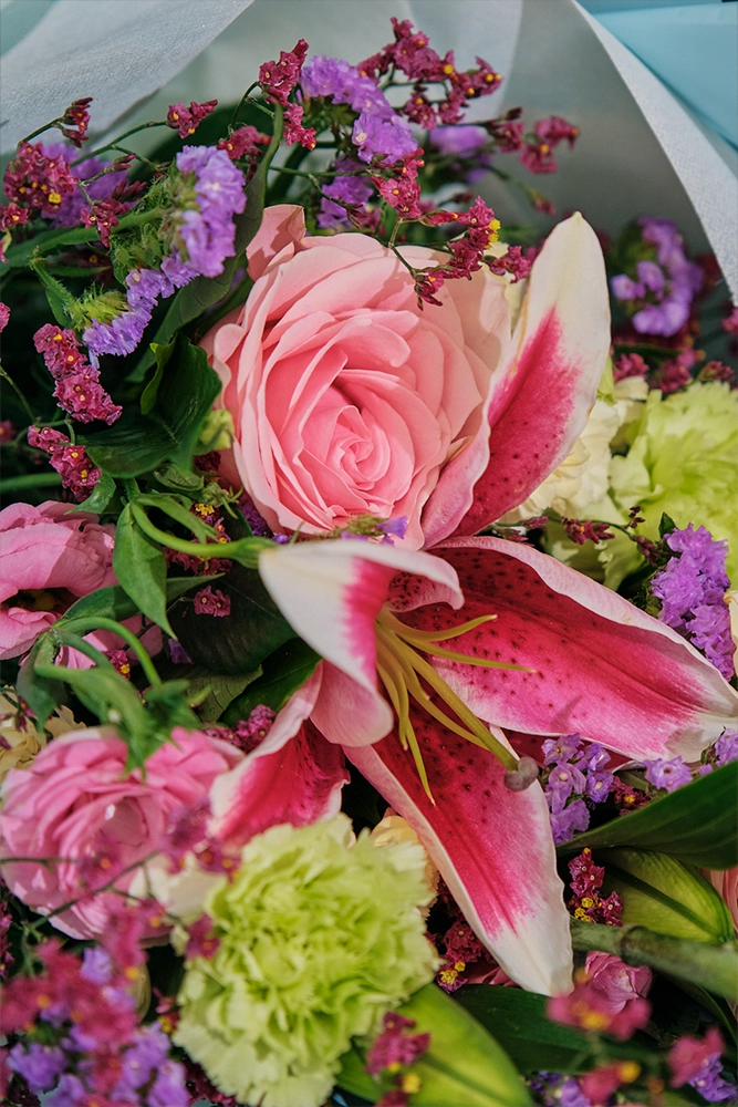 Petal Poetry Mini is a vibrant mix of colors to make the occasion bright. Made up of Stargazers, Roses, and Carnations.