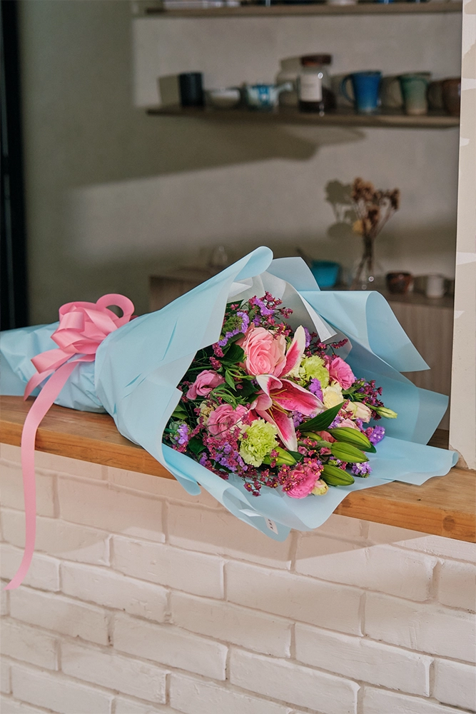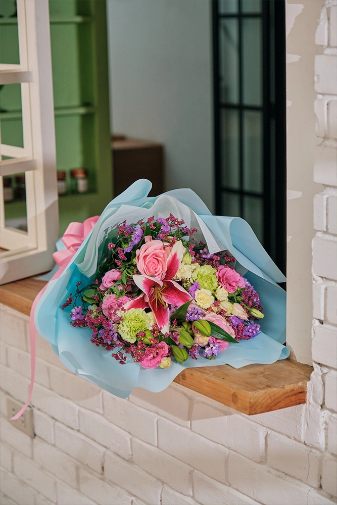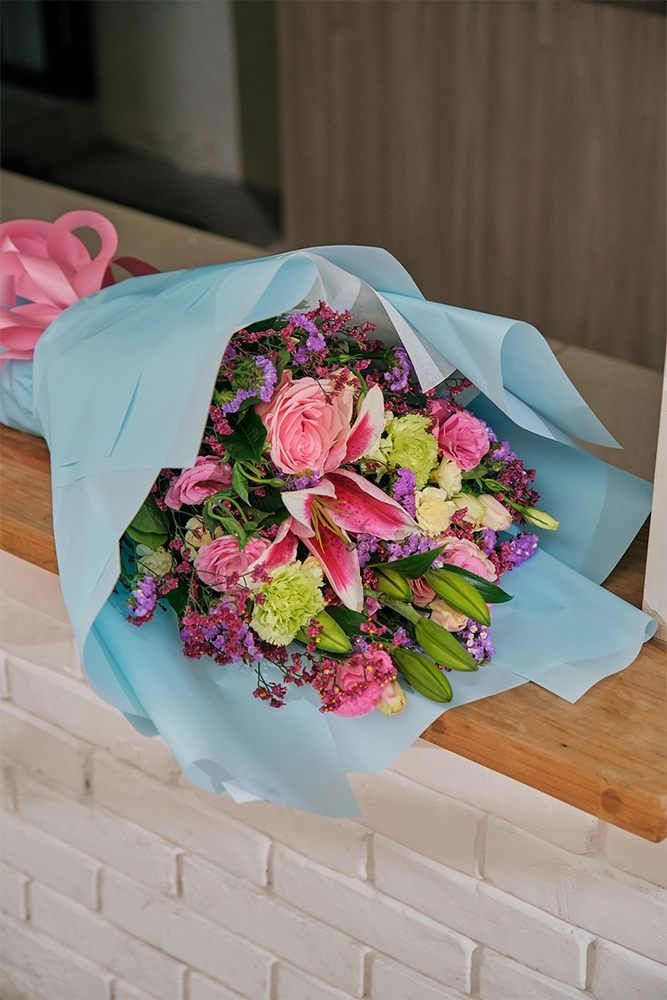 Petal Poetry is a vibrant mix of colors to make the occasion bright. Made up of Stargazers, Roses, and Carnations.