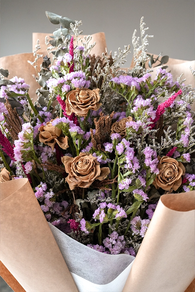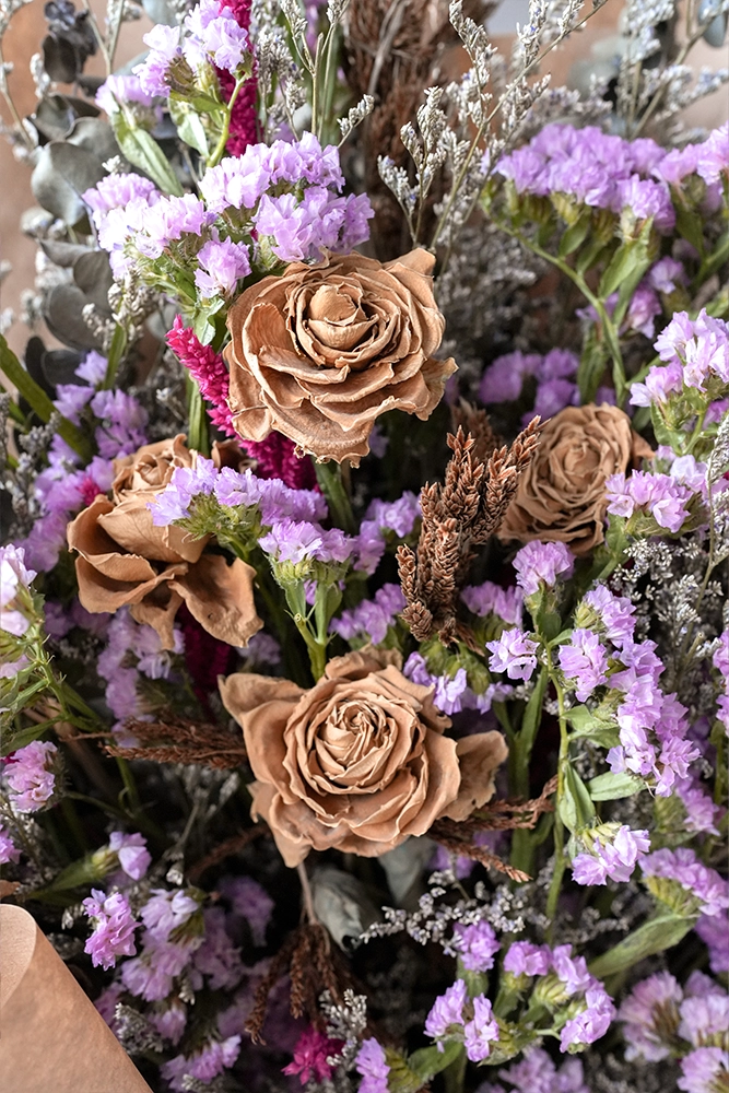 “Preserved Moment” is a timeless arrangement of earthy, dried roses intertwined with delicate sprays of purple statice and silver-green eucalyptus foliage.