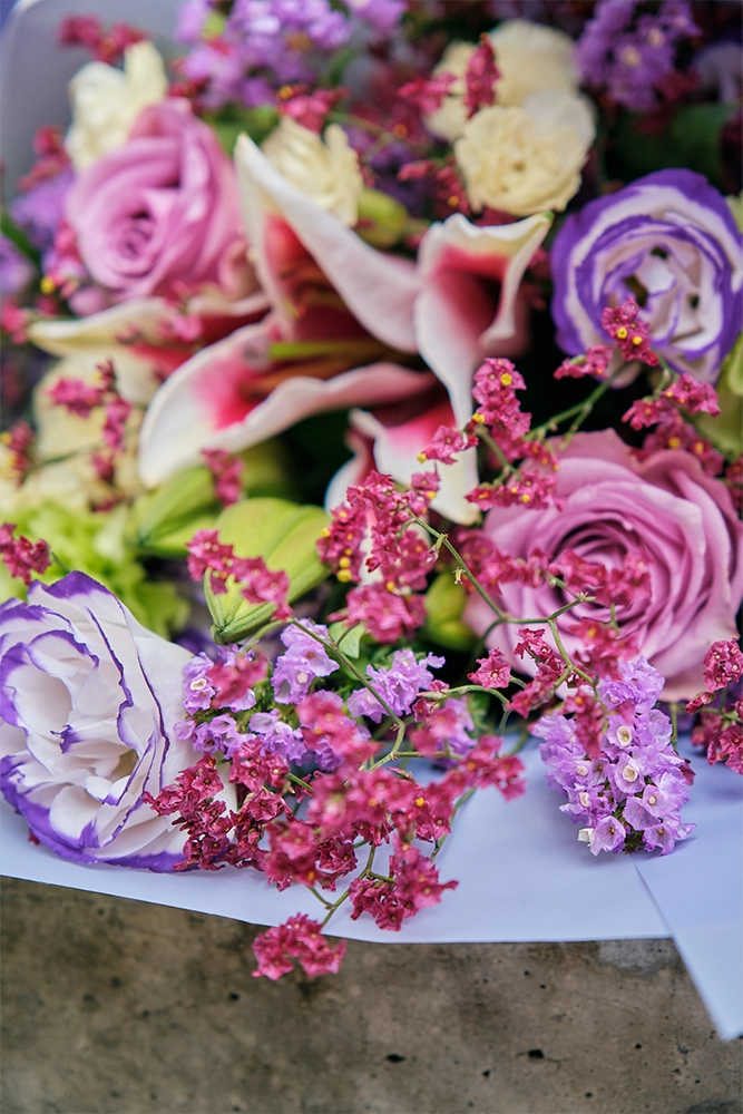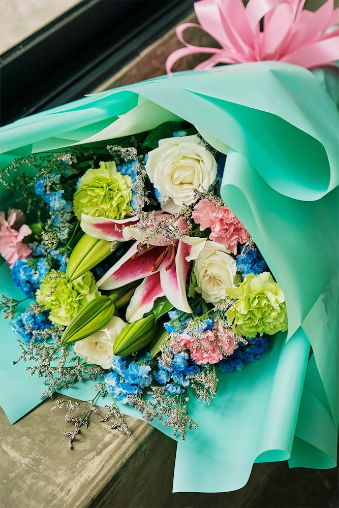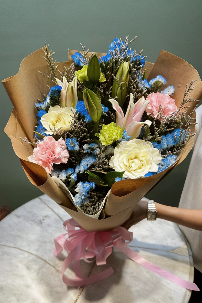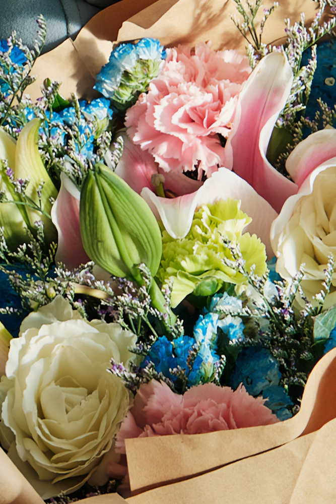 “Sweet Escape” is a vibrant, multi-colored bouquet featuring a striking Stargazers surrounded by fresh roses, carnations, and whimsical blue filler flowers.