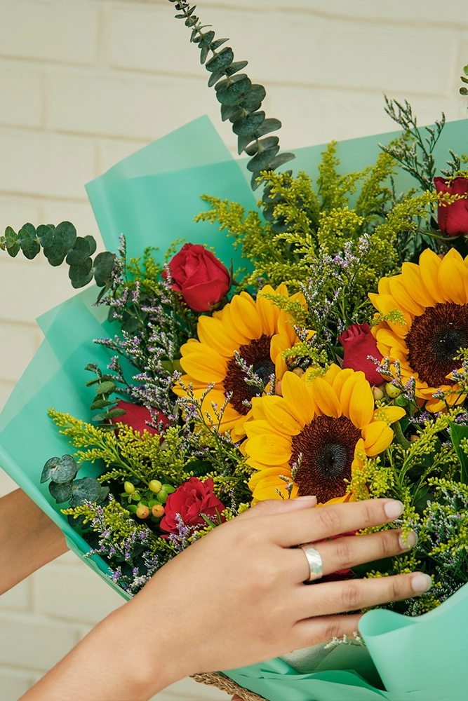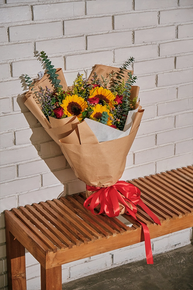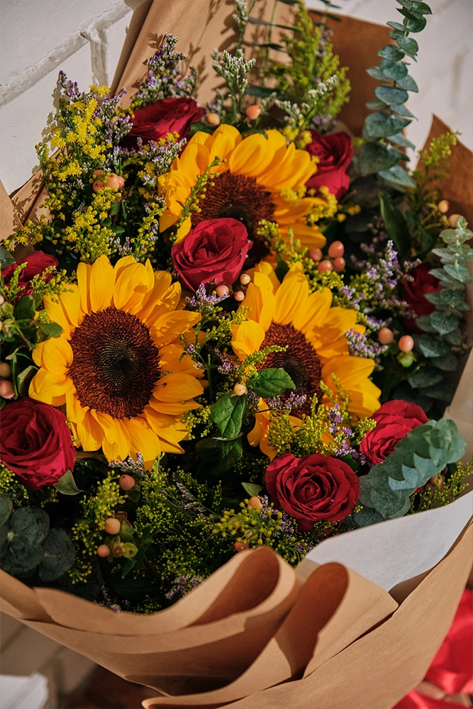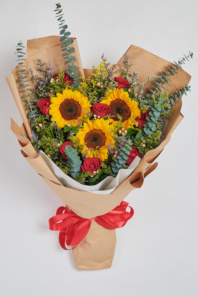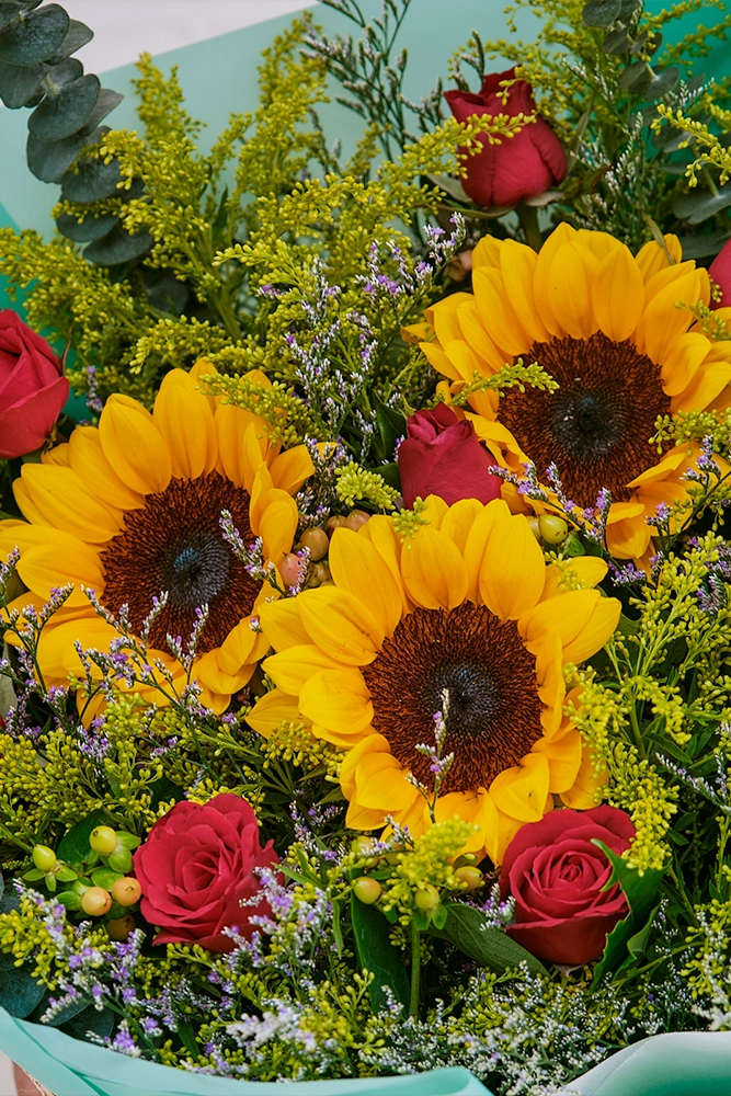 You Are My Sunshine is made up of Sunflowers, Local Red Roses, and a bunch of Fillers.